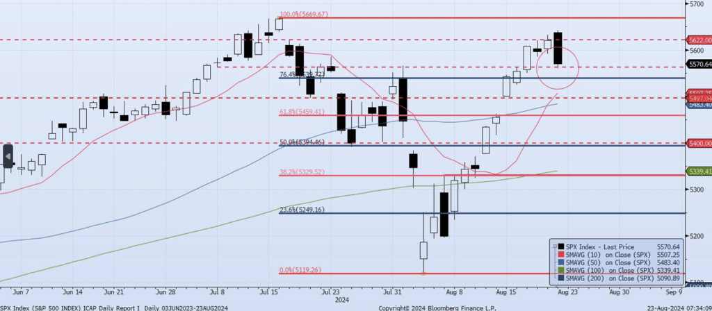 The SPX Index fell 90bps during yesterday’s session, closing at 5570. The 5600 level broke on both an intraday and closing basis. Price action created an outside reversal day (bearish) with a peak-to-trough move of -1.46%. Yesterday’s candlestick engulfed the previous two sessions but held at the 5560 support level. Remember, 5562 (highlighted in the chart) has been discussed for over a month as it is the Jul 8 (doji) low. My Momentum/Trend Model (MOTR) has shifted to Neutral and closed out the previous Positive signal with a +2.21% gain. As of the writing of this note the S&P 500 futures are trading +28 handles. I will continue to watch for additional degradation in market internals or for a resumed move higher in price and momentum/trend.