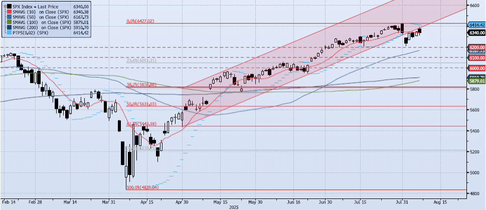 The SPX index lost a modest 8bps yesterday, closing at 6340. However, the session was much more volatile than that with a wide high/low range of 6389/6310 (over 1%). My momentum and trend indicators have improved slightly as the index struggles to break back into the uptrend channel which it gapped down out of on August 1. My Spot VIX signal is “risk on”. VIX Term Structure is “risk on” as well. The ACAP Momentum/Trend Model signal has shifted to Neutral. Overall, risk is evenly distributed here. That said, the index seems poised for a push back into the uptrend channel (see chart) and a potential breakout above 6400. If that does occur with a model shift to Positive, I would expect a test of 6600 in the intermediate term. The key here is can the index re-enter the uptrend channel within the next few sessions.