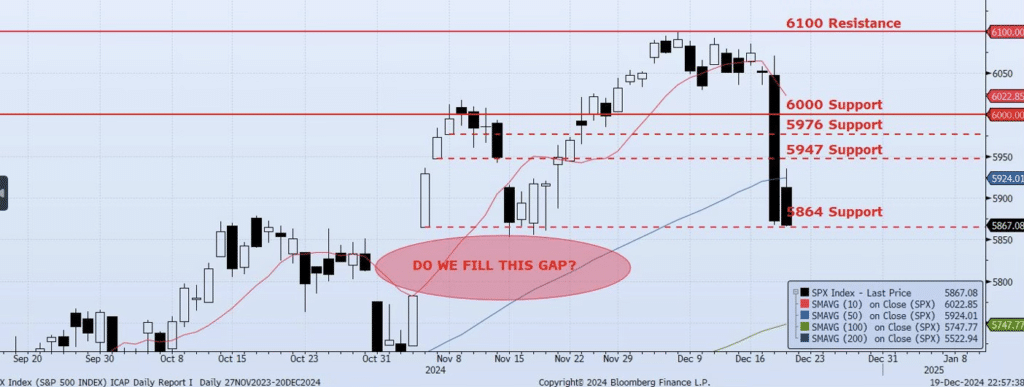 The SPX Index closed essentially flat at 5867 after a failed attempt to rally very early in the session. The high on the day was 5935 which was actually just 10 points shy of the 38.2% retracement of the Dec 18 bar. The Index did hold above the previously identified support level at 5864, and it needs to. A break at this level will set up for the Nov 5/Nov 6 gap (5783/5864) to be filled and potentially a test of 5700. Internals remain negative and have degraded further. Spot VIX and VIX Term Structure remain in a “risk off” posture. The ICAP Momentum/Trend (MOTR) Model signal remains Negative. Risk remains skewed to the downside despite the possibility of a rally into Dec 31. As I wrote yesterday “I could see a push back towards the 6000 level to close out the year. To be very clear, I would be a seller of any such rally as I believe this move has additional downside to come.”