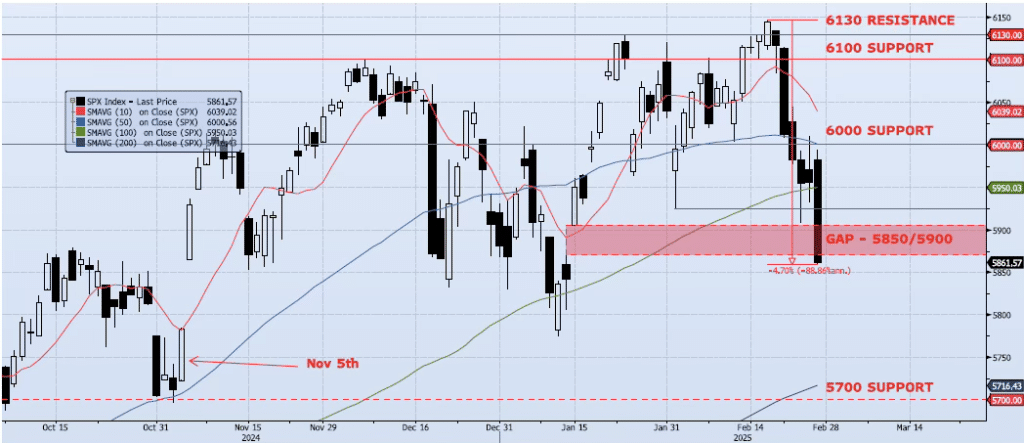 The SPX Index lost 1.59% on the day, closing at 5861. The index, as expected and predicted, has now sold off 4.70% (peak-to-trough) in just six sessions. Previously identified support levels have been undercut as momentum and trend indicators continue to degrade/confirm. Spot VIX and VIX Term Structure signals remain neutral to “risk off”. The ICAP Momentum/Trend (MOTR) Model signal remains Negative. As I wrote back on Jan 14, “I believe the Index is topping. This is a process and aggressive price action in both directions should be expected. Ultimately, any upside is to be sold with risk skewed to the downside. Targets remain 5700 and 5500 for the near term.” All higher downside price targets have now been achieved (see below) including the filling of the 5850/5900 gap (see chart). I continue to be a seller of the SPX index and a buyer of volatility as risk remains skewed to the downside.