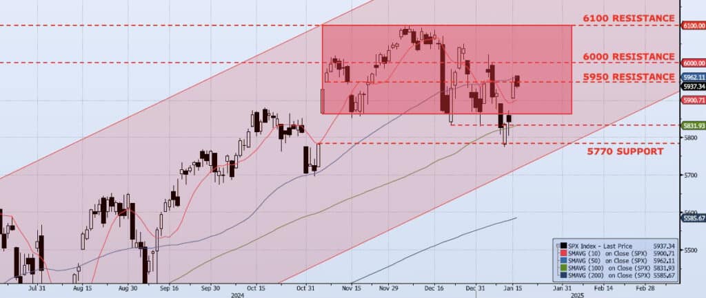 The SPX Index opened yesterday’s session at 5963, hit a high of 5964, and faded to close down 21bps at 5937. The stick was somewhat constructive as a little consolidation/pause is healthy after the three-day, trough-to-peak rally of over 3% we have had. While we did close below the highlighted 5950 resistance level, it is important to note are that market internals continue to hold/improve. Spot VIX and VIX Term Structure remain neutral to “risk on”. The ICAP Momentum/Trend (MOTR) Model remains in Neutral. In the near term I remain open to prices rising even further. In the Jan 14 note I wrote that “I believe the Index is topping. This is a process and aggressive price action in both directions should be expected.” The Nov 5/ Nov 6 gap I had been focused on was filled with the Jan 13 low of 5773. That stick created trade support at ~5770 (highlighted). As far as the intermediate/long term I see risk as skewed to the downside. There has been significant structural damage done to the Index over the past two months while momentum and trend counts have faded beyond what I consider consolidation within a strong up trend. For that reason, I hold a neutral stance short term while remaining a net seller of any rally we may see with ultimate downside targets for the SPX Index of 5100 and 4800. This view may change as data builds, but as of today this is what I see.