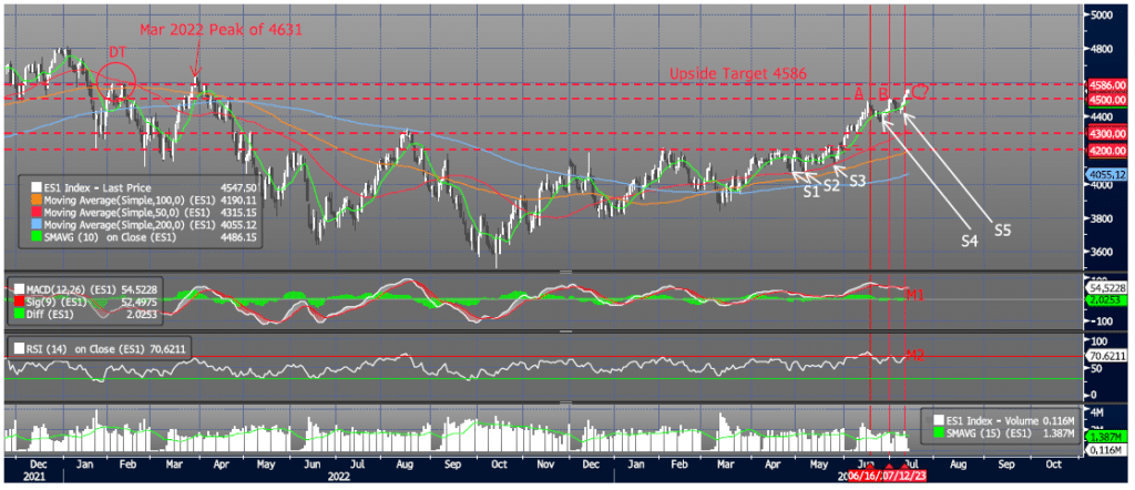 ES1 (SP500 Generic Front Month) - 7.14.23 On Wednesday I posed the question, would "C" prove to be the third fade from resistance at 4500 or would the Index breakout to the upside? I have clearly been of the opinion that the Index would not be able to breakout higher and, although I was correct on the first two fades (A, B), I was wrong this time (C). At this point, after creating a higher low off the A/B fades (S4, S5), price has broken and closed above major resistance (4500). Momentum (M1, M2) is confirming with a shift to positive. Although I think the move once again is extended I could easily see momentum carrying the Index to a near term upside target of 4586. This level represents the peaks of a double top (DT) formed back in Feb 2022 and is approaching the Mar 29 peak of 4631. Essentially 4500 has now become support and is the dividing line between upside and downside bias in my opinion. Trading Support: