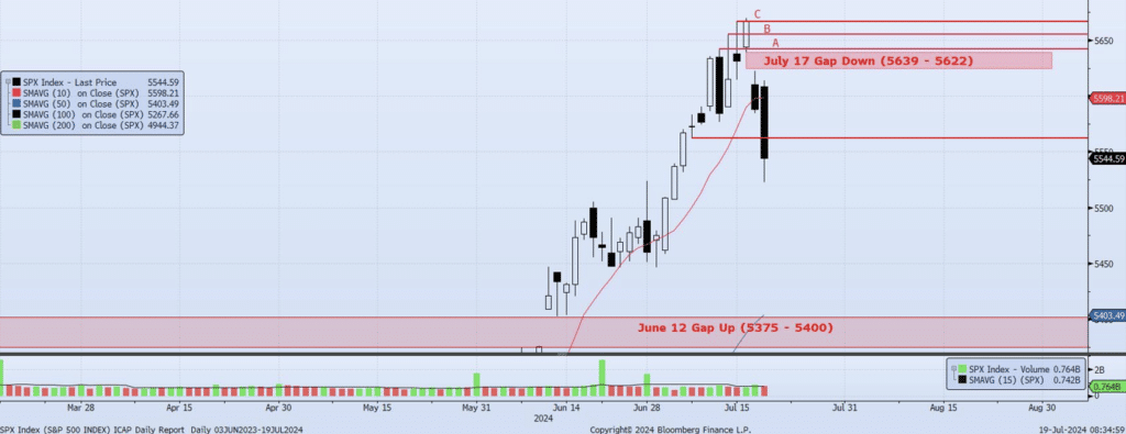 As expected, the SPX continued its downward retracement during yesterday’s session hitting a low of 5522 and closing down 78bps at 5544. As I have continued to write, “I remain confident that price weakness will expand and am focused on the support levels below as downside targets”. Well, this move down did just that taking out the first two of my highlighted support levels (5597 and 5562 (10dma)). I have continued to remain cautious over the past two weeks (broken drum) as negative divergence has persisted between price and momentum /trend. As I have stated, this created a shift in my MOTR model from Positive to Neutral. I wrote yesterday that I fully expected the MOTR model to shift to an outright Negative signal during the regular session and it did. The current peak-to-trough drawdown (Jul 16 to Jul 18) is currently -2.59%. I would not be surprised to see the SPX push back up towards the 5575/5600 level. I do not believe that will hold. The MOTR model suggests there is additional downside risk with a legitimate near-term target of 5400. The 5400 level represents the low of the Jun 12 gap and a 5% peak-to-trough move which is more than reasonable. It also represents the 38.2% Fibonacci retracement level for entire move from the Apr 19 low (ref 4953) to the Jul 16 high (ref 5669). So cool how these data points all overlay so neatly. Again, my cautious stance over the past two weeks has been due to the Neutral model rank. The model has now shifted to outright Negative. Risk remains to the downside. Have a great weekend everyone.
