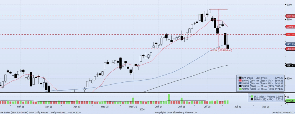 The SPX index was certainly volatile during yesterday’s session with an initial move down of 72bps, then a rally of ~1.90% followed by a slide to end the day of ~1.70%. None of this has been a surprise as I have been cautious on the market since early July. As the index was achieving all-time highs on July 16 I had established that my internal model (MOTR) was showing underlying weakness and negative divergence. On July 16 I wrote that “I am growing more confident each day that the model will shift to outright negative in the coming sessions and that support levels below will be tested in the near term”. With the index at 5667, those support levels identified below were 5562, 5589, 5500 and 5400 (archived report available on website below). The index subsequently sold off ~5% and has hit every one of my targets! Moving forward, the MOTR model remains Negative suggesting additional downside risk remains. That said the 5400 level is a major support line as it represents the base/support of the gap created from June 11 to June 12. A break below 5400 would create an immediate downside target of 5350 followed by 5300. I will continue to update this report as the MOTR signal shifts. In short, the model nailed this move down and risk remains to the downside in the near term.