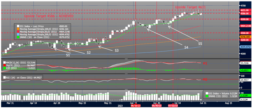 ES1 (SP500 Generic Front Month) - 7.28.23 In the last report on Jul 20 (took some time off for vacation), with the Index at ~4600, I stated that "I think the Index could easily take a breather here and test the 10dma (ref 4526) which is ~1.5% below the current Index price". On Jul 24 the 10dma had risen to 4551 and it was indeed tested as the Index retraced and hit a low that day of 4560. I had maintained that the next upside target was 4631 which marked the Mar 2022 peak. During yesterday's session the Index overshot this target by just 3 points hitting a high of 4634 and then reversing aggressively, selling off 80 points to a low of 4553. That price action could not have been more in line with our expectations. Note momentum (M1, M2) is negative and degrading. I think at this point we are watching for yesterday's low to hold and, if it doesn't, 4500 will become an easy downside target in the short term. I will continue to look for these tests of support and will focus on the internals as they play out. Trading Support: 4579: 10dma 4500: Previous Resistance; 76.4% Retracement Level 4400: Previous Support 4300: Previous Resistance; 50dma at 4404 Trading Resistance: 4586: Feb 2022 Double Top Peak 4631: Mar 2022 Peak
