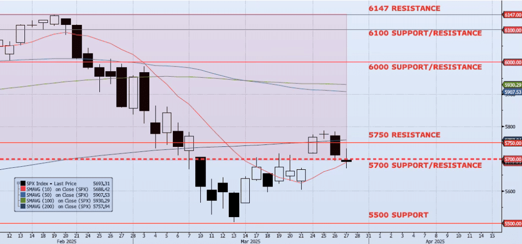 The SPX index fell 33bps on the day yesterday closing at 5693. This was the second “doji” formation in the past three sessions with a high/low spread of 38 points and an open/close spread of just two. More indecisive price action and, more importantly, the index closed below the 5700 level (base of the four month topping pattern). As I wrote yesterday morning, “the 5700 level needs to hold, or I would expect a relatively aggressive slide back to 5500.” Momentum and trend indicators seem to be losing steam as Spot VIX remains “risk on”. The ICAP Momentum/Trend (MOTR) Model signal remains Positive. However, if the index doesn’t recover 5700 tomorrow, I would expect the MOTR signal to shift to Neutral. As I have continued to write, I do not like the long trade here. I continue to believe that the greater risk overall remains skewed to the downside.