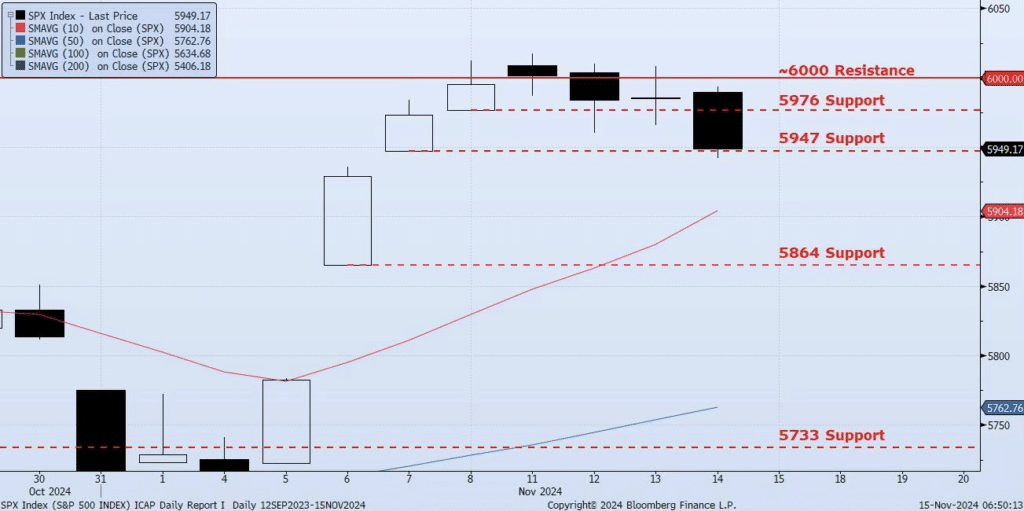 The SPX Index acted exactly as expected, fading yesterday -61bps to close at 5949. On Nov 8 I wrote that “On a trading basis I am looking for retracements within this move higher and would look for 5947 and 5864 to act as support.” I also wrote on Nov 12 that “Overall, it feels like a good spot to lighten up on some longs and take a breath” and that “Support at 5976, 5947 and 5864 remain in focus and would be healthy levels for the Index to test and hold.” We have now tested and broken 5976 and 5947 (intraday basis – low 5942). Internals have continued to fade. What’s interesting in the near-term is that volumes yesterday were light and Spot VIX and VIX term Structure did not really flinch. So, either this was a quick ~1.25% trim of the “Trump Nov 5” rally or there is a lot of supply and fear still to hit the tape. My gut is the latter of those two options. The ICAP Momentum/Trend (MOTR) Model shifted to Neutral on the close yesterday. I expect support at 5864 to be tested. A break there would set up for a potential revisit of the 5733 level. Note, that 5733 level has been a focus since Sep 19 following the FOMC 50bp rate cut.