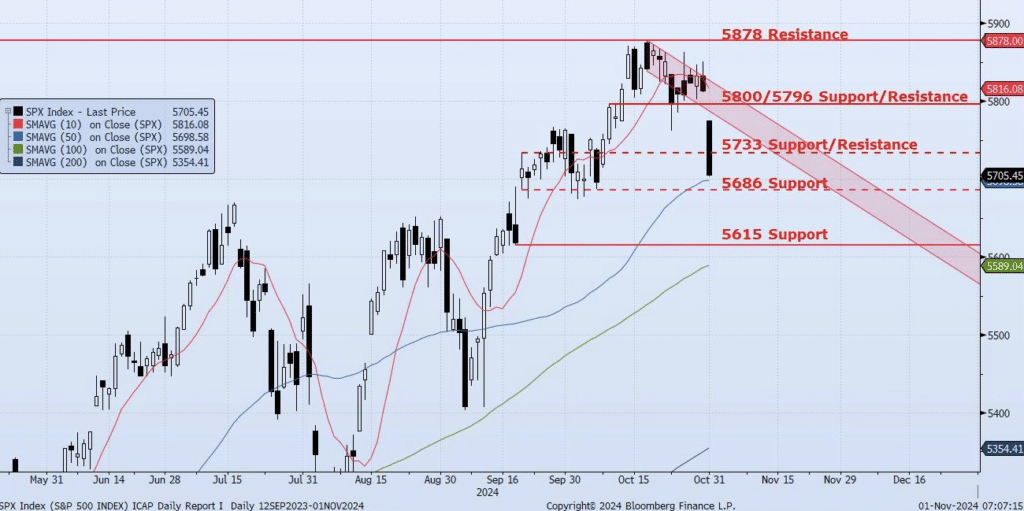 I wrote on Oct 29, “I do believe that we will see one final push out ahead of next Tuesday. My gut is that there will be a final move to derisk, trim and hedge long exposure. I expect 5800 to break and 5733 to be tested before we start filling in ballots on Nov 5”. I reiterated on Oct 30 writing that “I continue to expect 5800 to break and 5733 to be tested before we start filling in ballots on Nov 5”. Finally, I wrote in yesterday’s note that “I expect 5800 to be tested and to break leading to an aggressive move down to 5733”. Well, The SPX Index gapped down yesterday, opening at 5775 (breaking support at 5800), breaking support at 5733, hitting a low of 5702 and closing at 5705. Absolutely amazing price action and directly in line with my expectation. Price has broken down with confirming momentum and volume. The ICAP Momentum/Trend (MOTR) Model remains Negative. While the risk of a snapback rally exists, risk overall remains to the downside. What Trumps all of this over the near term is the massive price volatility that will result from Nov 5. Regardless of the election results, the process and emotion will create "yuge", volatile price swings. The next downside target is 5686. I do expect us to hit that target but it is a much more difficult trade than the one we just saw.