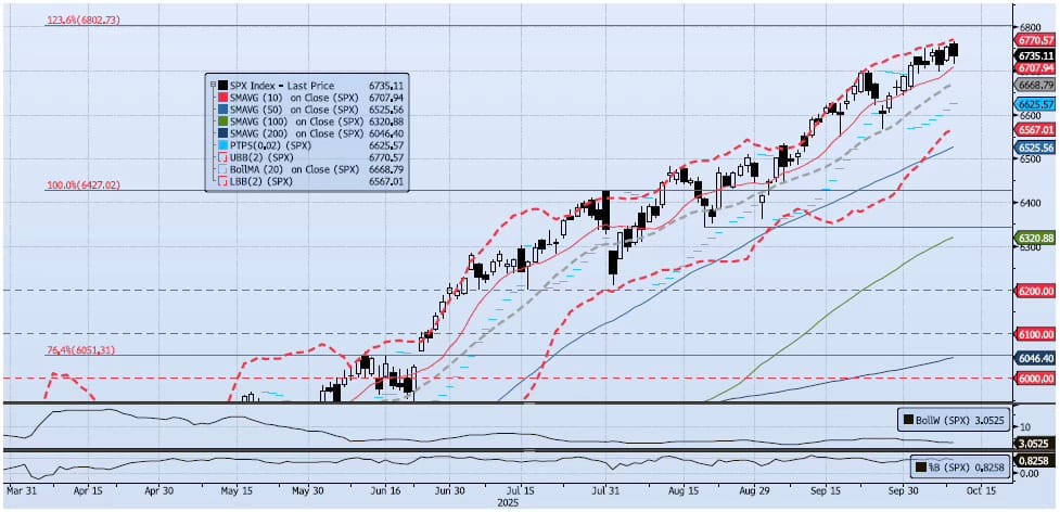 The SPX index lost 28bps on the day, closing at 6735. Momentum and trend indicators are consolidating but remain net positive. My Spot VIX signal remains “neutral”. My VIX Term Structure signal remains “risk on”. The ACAP Momentum/Trend Model signal remains Positive. Even as the current signal appears to be close to flipping, I continue to see risk as skewed to the upside with a test of 6802 in the near term likely.