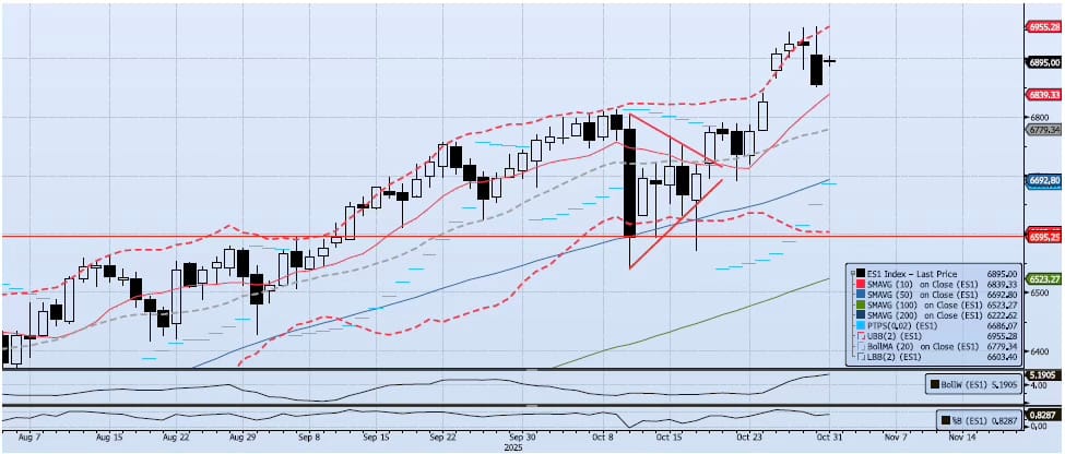 The ES1 Index (Generic 1st Month S&P 500 E-mini) lost 97bps, closing at 6855, after hitting a new all-time intraday high in the overnight session at 6953. My Spot VIX signal remains “risk on”. My VIX Term Structure signal is “risk on”. The ACAP Momentum/Trend Model signal for the ES1 Index is Positive. I continue to see risk skewed to the upside from here as the index is poised to test 7000/7050 before year end.