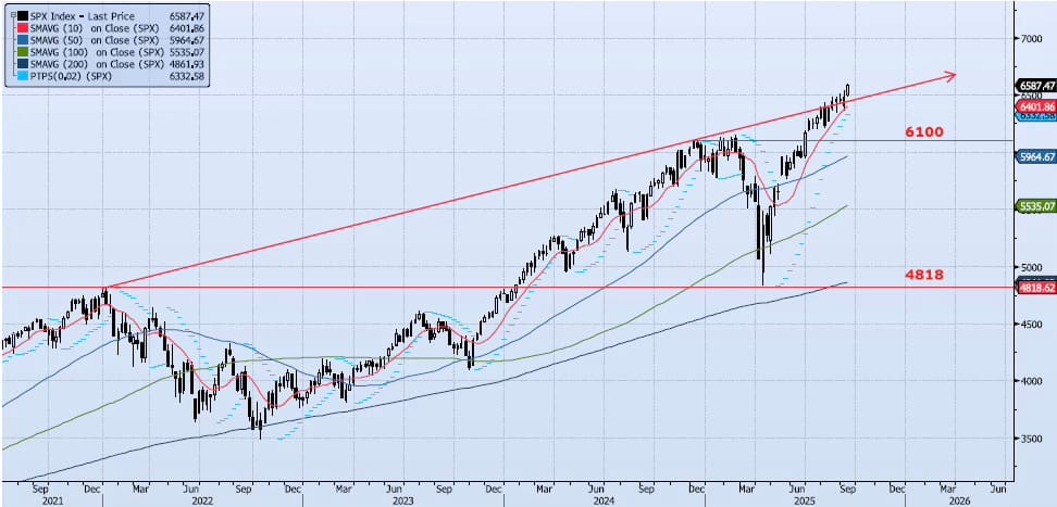 The SPX index gained 85bps during yesterday’s session, hitting a new all-time high (ref 6592) and a new all-time closing high at 6587. Momentum and trend indicator improvement is gaining steam. My Spot VIX signal remains “neutral”. My VIX Term Structure signal remains “risk on”. The ACAP Momentum/Trend Model signal is Positive. I continue to see the string of all-time closing highs to continue (reminiscent of 2021/2022) beyond the current count of 21. I continue to expect a run to the 6700/7000 range before year end.