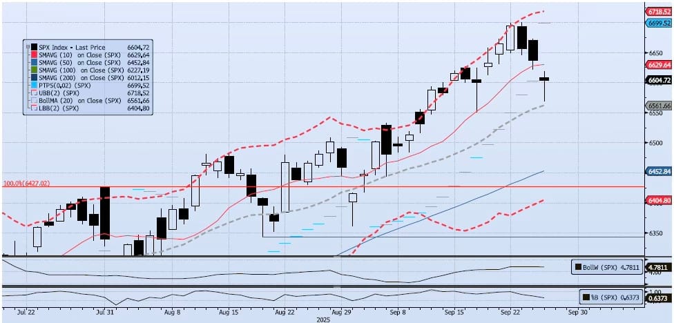The SPX index lost another 50bps during yesterday’s session, closing at 6604. This competes a 3-day, down 1.33% move. Although price has faded, this move has been well contained. The index has found support, as expected, at 6600 and at the 20dma (ref 6561) which is included in the Bollinger Band overlay. That said, momentum and trend indicators have faded significantly. My Spot VIX signal remains “neutral”. My VIX Term Structure signal remains “risk on”. The ACAP Momentum/Trend Model signal remains Positive but is extremely close to a direct flip to Negative. This will be watched closely but for now I would be a buyer of the index as risk remains skewed to the upside.
