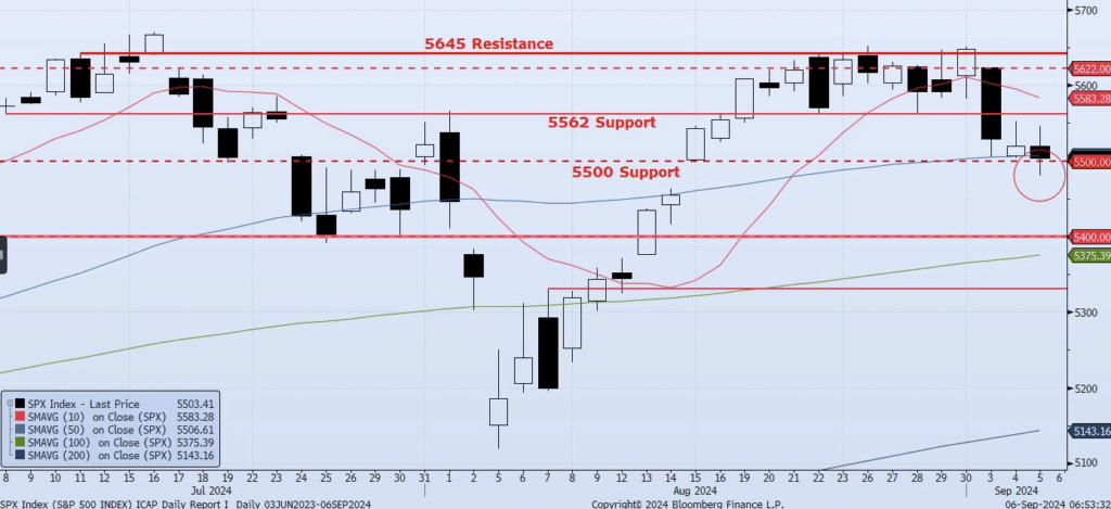 The SPX Index lost 30bps on the day as the 50dma (ref 5506) and the 5500 levels were both violated. The Index did recover from an intraday low of 5480 to close above 5500. However, the recent move back down from 5645 resistance has been significant. Identified support levels continue to break (see below) as negative momentum and volume increase. Additionally, as I have stated, my Momentum/Trend (MOTR) Model went Neutral back on Aug 22 and flipped to outright Negative two sessions agon on Sep 3. The VIX is also finding a comfortable spot above 20 as term structure quietly works its way towards backwardation (risk off). Overall, I continue to see risk skewed to the downside and am becoming more confident that a test of the 5400 level is very likely in the near term.