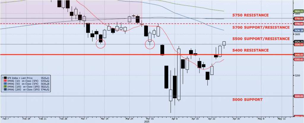 The SPX index gained 74bps during Friday’s session, closing at 5525. Momentum and trend indicators continue to improve as the index has now taken out resistance at 5500 and is filling the Apr2/Apr3 gap (Liberation Day+1). My Spot VIX model signal remains “risk on” and VIX term structure remains neutral. The ICAP Momentum/Trend Model signal remains Positive. As I wrote last week, “if internals can hold and the ICAP Model signal remains Positive, I could see this rally potentially testing 5700.” However, I believe the risk of a hard reversal back down outweighs any potential upside gain. With that, I am watching the ICAP Model signal and price action for better entry points to re-establish my shorts. As the cycle ends, and risk becomes balanced I will begin to take normal upside exposure. We are just not there yet. As I have continued to write, “I continue to be a seller of these rallies, not a chaser as my overall view is still negative. I remain confident that the near-term downside targets of 5000 and 4800 will be achieved. I continue to believe that my intermediate/longer term downside targets of 4200 and 3700 will be achieved before the current cycle ends.”