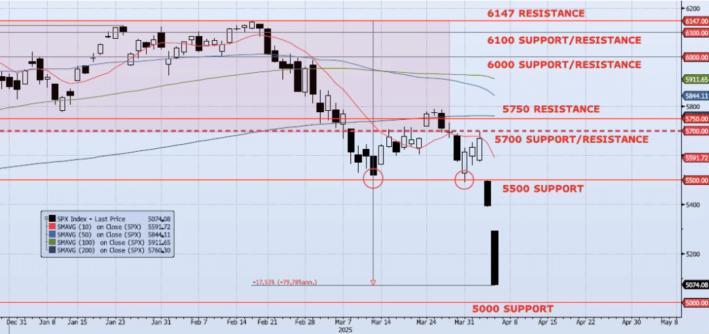 The SPX index fell an additional 5.97% on Friday as the sell-off accelerated. The peak-to-trough move is now down over 17% from the Feb 19 all-time high of 6147. Momentum and trend indicators continue to degrade as Spot VIX and VIX term structure scream “risk off”. The ICAP Momentum/Trend (MOTR) Model signal remains Negative. My chart has not changed, my model has not changed, and my view has not changed since December (my X post from December 23rd below). While I am frustrated with all the late comers now feeling bearish, I find some comfort in the fact that anyone capable of critical thinking can see that they are truly “dumb money” and hide behind the herd and coordinated headlines and narratives. All that said, I remain very confident in my minimum downside target of 5000. I do believe we could see some counter trend bounce off that level but, as I have been saying since December, all rallies for the near term are to be sold, not chased. Below the 5000 level I see additional targets of 4800, 4200 and 3700 (see below). It is my opinion that we will see 3700 before this bear market is complete. This will be a process as it always is. As a reminder, the 2007/2009 bear market was a 57% drawdown which saw five countertrend rallies of between 5% and 30%. This time will be no different.