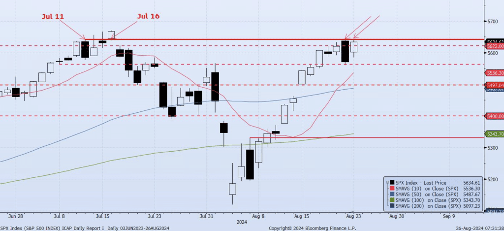The SPX Index added 1.15% during Friday’s session closing at 5634. The Index hit a high of 5641, which was just shy of the previous day’s high of 5643. This is an interesting level as it is also the Jul 11 high (ref 5642) and the Jul 16 open (ref 5644). As you can see on the chart, Jul 11 was a large reversal bar heading into the Index peak of 5669 on Jul 16. There is clearly near-term resistance here as the Momentum/Trend (MOTR) Model enters the second day of the current Neutral Signal (the previous signal was a 6-day Positive Signal which returned over 2%). I do believe that a true breakout above ~5645 will lead to an aggressive move through 5669 and most likely to 5700. However, I am somewhat cautious here due to the MOTR Neutral Signal and developing signs that the VIX may be ready to lift higher once again. I will continue to focus on internals and a potential MOTR shift either to Positive or Negative.