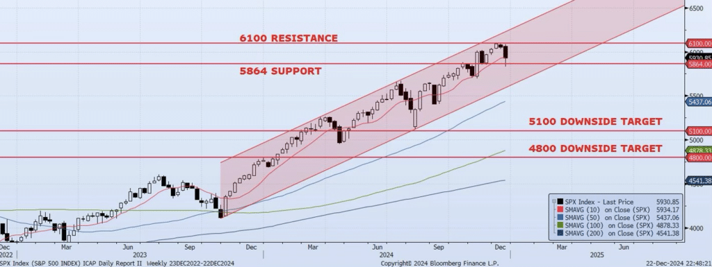 The SPX Index broke previously identified support at 5864 very early in the session, hitting a low of 5832. The Index then rallied over 2.5% to hit a high of 5982 and closed up 1.09% on the day at 5930. Overall, the breakdown on Dec 18 was drastic and did some real damage to the Index. Price, momentum and trend all broke/confirmed. I had identified the possibility of that break along with the aggressive spike in Spot VIX in the week(s) prior (all Morning Notes are archived at ascalonvicapital.com) and was very well positioned to take advantage. I also noted in the Dec 19 note that although risk remains skewed to the downside there could be a year end rally as high as 6000. I remain confident in this overall view. The Dec 18 selloff was the beginning of a larger move to the downside which I believe will accelerate in Q1. Any rally higher from current should be strategically sold, not chased. The ICAP Momentum/Trend (MOTR) Model signal remains Negative. The recent peak-to-trough move in the SPX of -4.39% was not a blip. I believe the Index is set up to test 5100 and potentially 4800 over the coming months. For a clean view, the chart below is on a Weekly count and simplifies the current trading range as well as highlights the current intermediate term downside targets.