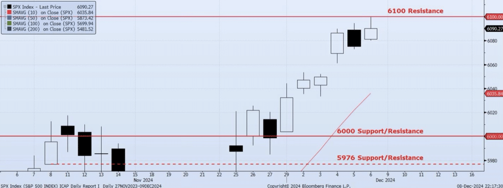 The SPX Index hit both an all-time intraday high (ref 6099) and closing high (ref 6090) during Friday’s session. Internals are relatively supportive with momentum and trend indicators positive to flat. Spot VIX and VIX Term Structure remain in a “risk on” posture. The ICAP Momentum/Trend (MOTR) Model signal did shift to Neutral after a +1.72% gain on the previous Positive signal. I would expect trading to begin to slow down as we head deeper in December and with it a decreased probability of a push much beyond the current highs. Overall, I expect the Index to trade near current levels for the balance of 2024 with a slight risk of some downside retracement heading into year end.