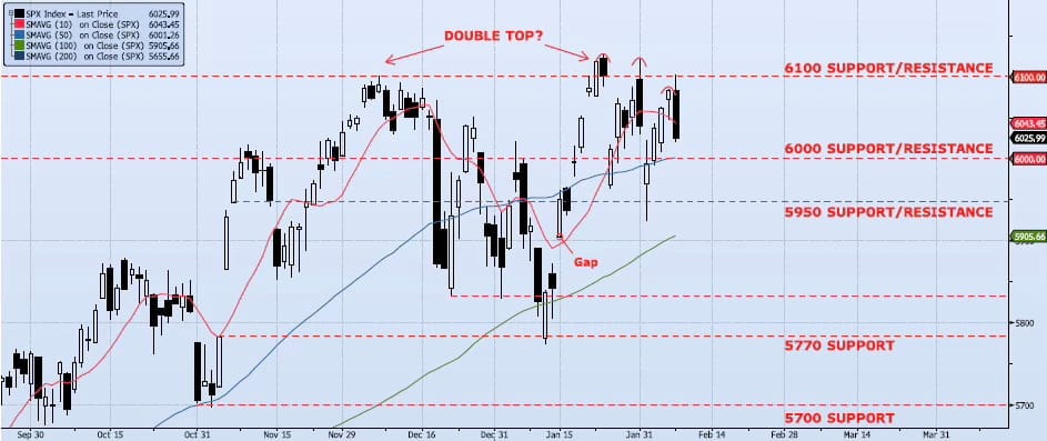 The SPX Index fell 95bps during Friday’s session, closing at 6025. As I have continued to reiterate over the past few weeks, price is showing signs of topping near all-time highs as momentum and trend indicators continue to degrade. Additionally, Spot VIX and VIX Term Structure signals remain mixed/neutral. The ICAP Momentum/Trend (MOTR) Model signal remains Neutral. A shift to Negative under the current set up would lead to a significant move to the downside with a test of 5700 very likely. I have remained cautious since early December and have continued to note extreme volatility and a lack of conviction as the index has continued to test resistance at 6100 with an inability to break above. As I wrote last week, “there is more underlying risk than price would suggest. I remain very cautious, paired down and believe that the greater risk is to the downside.”