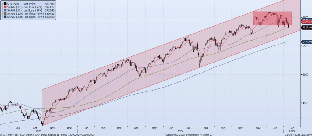 The SPX Index acted exactly as expected, selling off 1.54% during Friday’s session to close at 5827. The low on the day came down almost 2% at 5807 and marked an intraday violation of the 100dma (ref 5820). Momentum and trend signals continued to weaken. Additionally, Spot VIX was able to breakout above the previously mentioned 19.50 level hitting a high of 20.31 and closing at 19.54. The ICAP Momentum/Trend (MOTR) Model signal remains Negative. As identified support at 5830 begins to break, the Index is now down ~5% from the all-time highs at 6099.97. I continue to see risk skewed to the downside (as I have since early December). As I wrote last week, “The Nov 5/Nov 6 gap still needs to be filled and would suggest a near-term downside target of 5700. Additionally, I fully expect a 10% peak-to-trough move in the intermediate term, suggesting a downside target of 5500.”