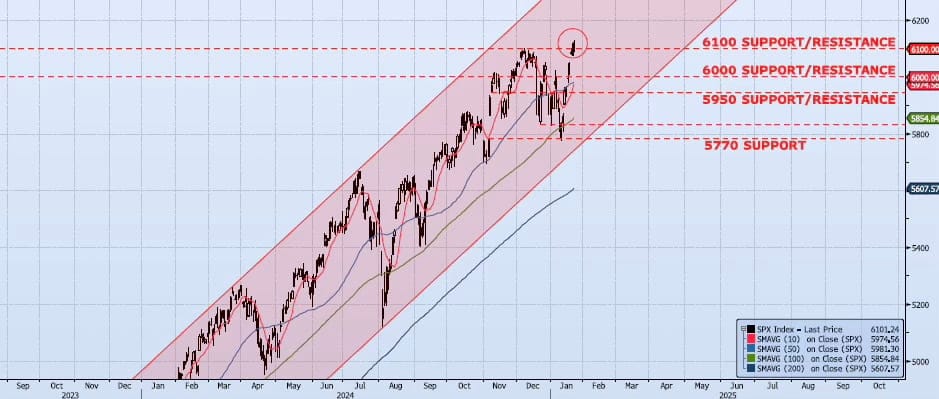 The SPX Index faded just 29bps during Friday’s session, closing at 6101. That said, the Index also achieved a new all-time high (ref 6128) but, more concerningly broke back below previous support at 6100 with a low of 6088. This retest at 6100 (and minor violation) are digestible as long as 6100 holds and internals don’t fade. As of now that’s the scenario with some additional bullish signals from Spot VIX and VIX Term Structure. Additionally, the ICAP Momentum/Trend (MOTR) Model signal remains Positive. I continue to see near term upside as probable as I remain very focused on whether the Index can repair the longer-term damage that was done over the past two months. My gut is that this repair will not occur. So, more near term upside likely, but I remain very negative on the coming quarters. As far as positioning I am paired down and waiting for a better set up.