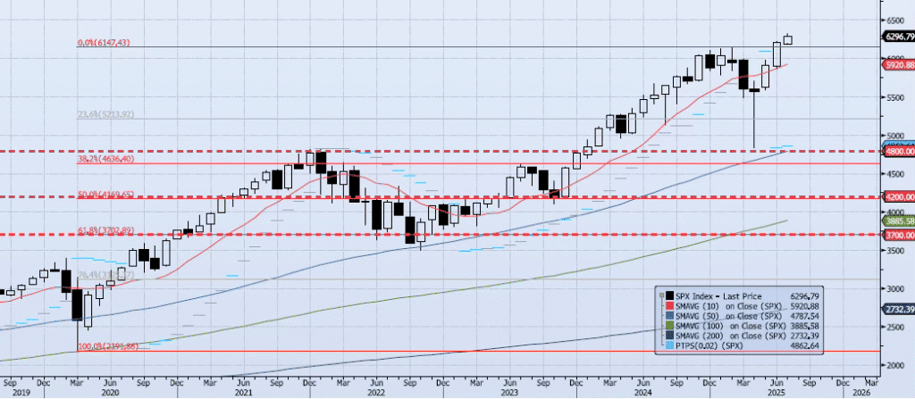 The SPX index was flat for the day Friday, closing at 6296. While the index hit yet another all-time intraday high at 6315, the underlying momentum and trend indicators remain flat to negative. My Spot VIX signal is “neutral”. My VIX Term Structure signal is “risk on”. The ACAP Momentum/Trend Model signal is Negative. Although the index seems unwilling to break, internals and underlying divergences suggest it is also becoming unable to rally any higher. All said, the greater risk in the near term is to the downside.