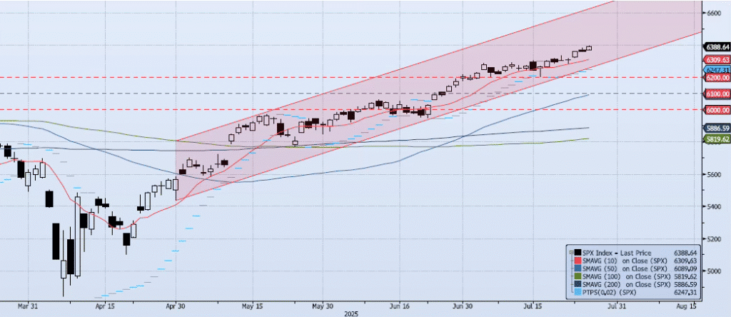 The SPX index gained 40bps during Friday’s session, closing at a new all-time high of 6388. The index remains at/near the previously identified upside target of 6390. My momentum and trend indicators are improving as the index seems to be building up steam for a full test of 6400. My Spot VIX signal is “neutral”. My VIX Term Structure signal is “risk on”. The ACAP Momentum/Trend Model signal is Neutral. I would expect a shift to Positive if we see another session of productive price action. That said, although you could easily make the argument that the index is extended here, a breakout above 6400 with a confirming ACAP signal could create a hard push up to the 6600 level. The coming week will be very telling.