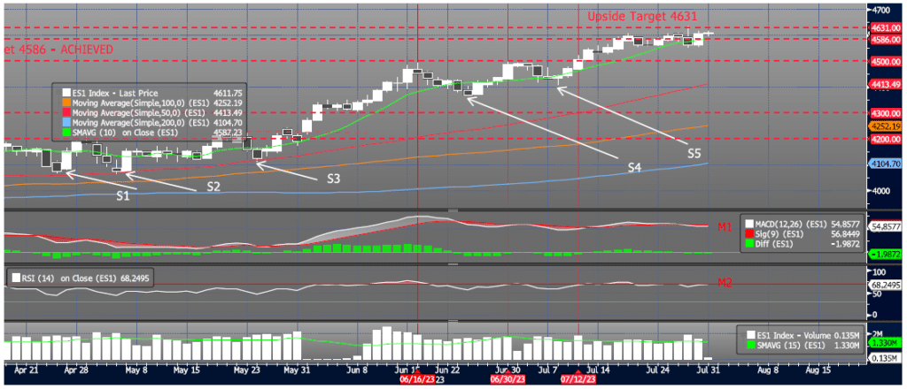 ES1 (SP500 Generic Front Month) - 7.31.23 The lows for 5 of the last 7 sessions ranged from 4550 to 4560 creating solid short term trading support. Additionally, we remain unable to breakout above our 4631 resistance level with negative momentum (M1, M2). All said, I would focus on the support/resistance range of 4550/4630 as a great place to "churn" while watching for a break either way with confirming momentum. I see risk here as essentially neutral with a slight negative bias and more price action needed to add to any conviction. Trading Support: