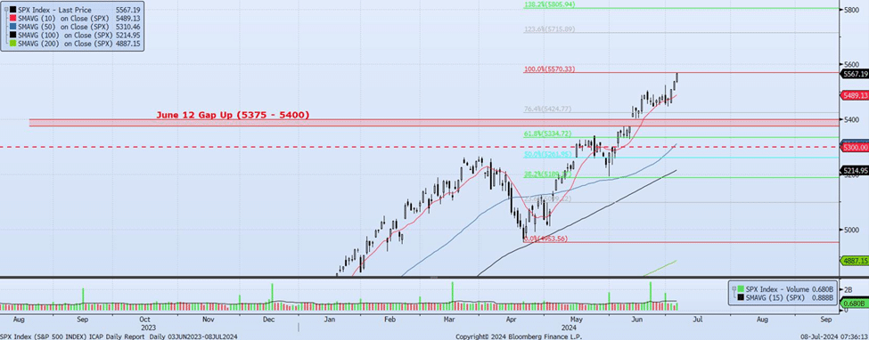 The June 28 report highlighted my expectation that the SPX index would “test support at 5400 in the near term with the additional downside risk of filling the 5375-5400 gap and potentially testing 5300”. The bullish gap up on June 12 had seemed to run its course and as my momentum and trend signals faded/diverged from higher prices I felt that risk was skewed to the downside. I did note in that same report that “a break above 5500 with confirming momentum counts would shift my view”. The index has clearly rallied well above 5500, closing the holiday week out at 5567 (albeit on light volume). However, momentum has not confirmed this bullish move. Price is king. As such, the obvious call here is to be bullish and expect an upside target of 5600 to be achieved in the near term. I would add a good note of caution to that as my model continues to flash weak market internals producing the potential for a quick and aggressive counter trend move to the downside. Bullish here is perfectly logical based on price but I remain cautious with a light book until the divergence between price and internals resolve themselves (to the upside or downside).