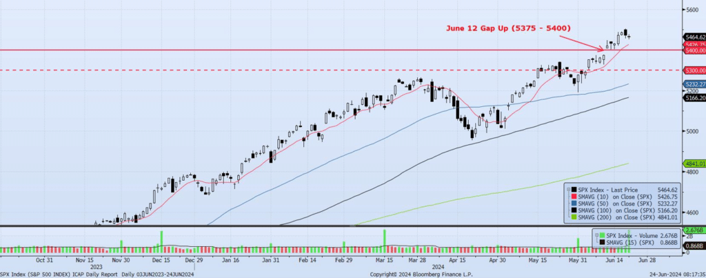 Over the past 7 sessions, the S&P 500 Index has continued to build upon and hold support at the 5400 level. This level is key as it represents the lows/base of the “island” which has developed coming off the June 12 gap up (thank you soft CPI data). The index has subsequently hit an all-time high of 5505 on June 20 and closed out last week at 5464.