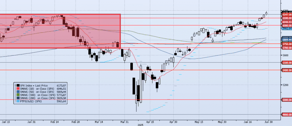 The SPX index gained 52bps during Friday’s session, closing at 6173. Not only did the index mark a new all-time closing high, but it also marked a new all-time intraday high at 6187. Last week was admittedly a bad one for a fund-raising trip, but let’s recap quickly. After a drawn-out Negative signal that essentially churned around 6000 for two weeks, the index was able to breakout above 6000 with a confirming signal shift to Positive. Headline risk aside, momentum and trend indicators are solidly confirming higher prices. My Spot VIX signal has shifted to “neutral” from a very productive “risk on” signal which triggered back on May 26. My VIX Term structure signal is “risk on”. The ACAP Momentum/Trend Model signal is Positive. All in, the index is breaking out in the face of some real underlying concerns. It would be foolish to fight what seems to be substantial upside risk.