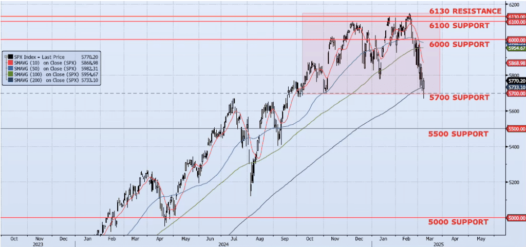 The SPX Index hit an intraday low on Friday at 5666 (down 1.26% from previous close and down 7.83% from peak), then rallied to close +55bps at 5770. The index remains under pressure, smashing through the previously identified support level at 5700 on an intraday basis. This level is extremely significant as I have identified it as the base of the topping pattern back in December. The breach of this level was damaging. A close below this level will be the beginning of the next leg down for this move. The ICAP Momentum/Trend (MOTR) Model signal remains Negative. As always, I would be ready for snap back rallies understanding that the greater move in the coming months should bring the index to the 5500 and 5000 levels.