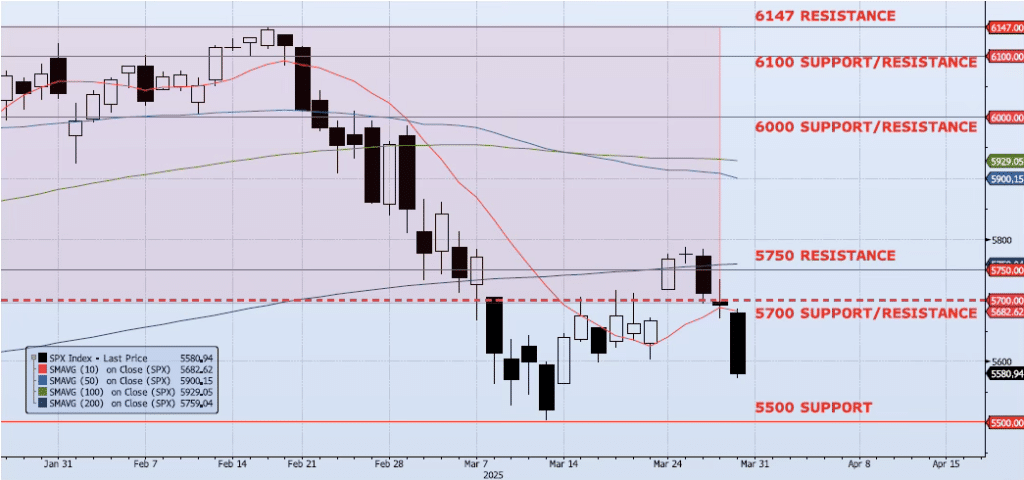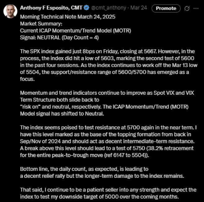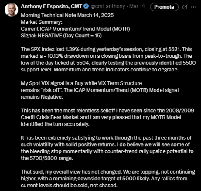 On Mar 14th I wrote, “I do believe we will see some of the bleeding stop momentarily with counter trend rally upside potential to the 5700/5800 range. That said, my overall view has not changed. We are topping, not continuing higher, with a remaining downside target of 5000 likely. Any rallies from current levels should be sold, not chased.”