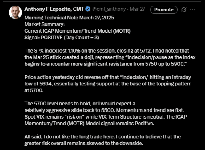 The SPX index fell 1.97% on the day Friday, hitting a low of 5572 and closing at 5580. Momentum and trend are breaking down aggressively. Spot VIX does remain “risk on” but VIX term Structure is neutral and moving quickly towards “risk off”. The ICAP Momentum/Trend (MOTR) Model has shifted to Negative. As the recent +5.13% counter trend rally from 5504 to 5786 ran its course, I have been very consistent and blunt.