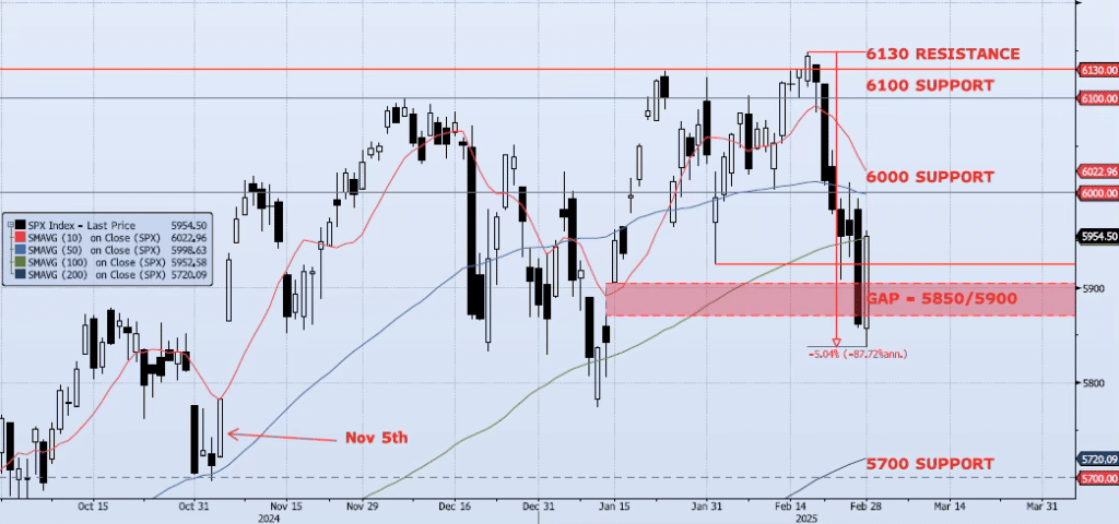 The SPX Index hit a low of 5837 during Friday’s session and then rallied to close +1.59% at 5954. This “relief rally” makes sense as the index has sold off over 5% in just seven sessions. The recent slide was as expected as four of five downside support levels have been taken out (including the 5850/5900 gap) leaving just 5700 untouched and below. Momentum and trend indicators remain negative. Spot VIX and VIX term structure remains “risk off” according to my count. The ICAP Momentum/Trend (MOTR) Model signal remains Negative. While I would not be surprised to see the SPX index rally to and potentially slightly above the 6000 level, I remain a seller of the index and a buyer of volatility for the near term. The greater risk remains skewed to the downside.