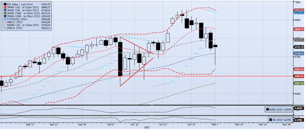 The ES1 Index (Generic 1st Month S&P 500 E-mini) gained 9bps during Friday’s session, closing at 6753. This close was significantly higher than the late session low of 6655 (marked an intra-day move of -1.36%) and created what I see as a reversal bar ending the recent Oct 30 through Nov 7 peak-to-trough downside move of -4.29%. It is important to note that the index, over the past 7 sessions, has faded from breaking above the upper Bollinger Band (ref 6953) to essentially testing the lower band (ref 6655). This move was aggressive and orderly but developed with mixed confirmation. While momentum and trend indicators faded and confirmed price action, volatility and spot VIX indicators remained tempered. All in, the ~5% dip seems to have run its course. As I mentioned last week, I would be short below 6730. Above that level I would remain flat and ready to take on long exposure heading into December.