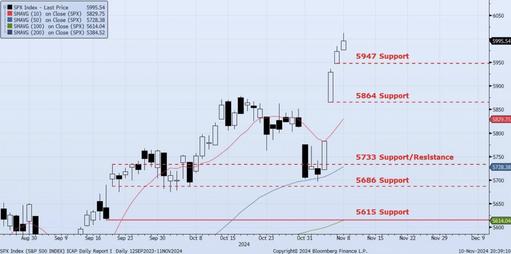 The SPX Index added to the Trump Rally for the fourth session closing +38bps at 5995. The Index did briefly break above previously identified resistance at 6000, hitting an intraday high of 6012. This was also the fourth consecutive session in which the Index opened on the low and worked essentially higher for the entire session. The Index has now gained 4.77% from the Nov 5 Open through Friday’s close. Internals remain supportive, volume is above average (has faded slightly over the past three sessions) and spot VIX has been crushed, closing at 14.94 on Friday (lowest close for spot VIX since Aug 19). The ICAP Momentum/Trend (MOTR) Model remains Positive as risk remains to the upside. A breakout above 6000 seems very likely but as I wrote last week, “On a trading basis I am looking for retracements within this move higher and would look for 5947 and 5864 to act as support.”