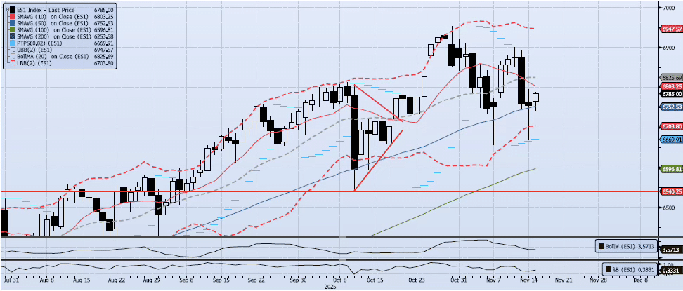 The ES1 Index (Generic 1st Month S&P 500 E-mini) lost 7bps during Friday’s session, closing at 6755. The session low ticked down 1.32% from the previous close, slicing through the lower Bollinger band. This low was hit at the start of the cash session. The index held and essentially rallied for the balance of the day, showing resilience and demand for cash equities. Back on Nov 10 I wrote, “the ~5% dip seems to have run its course. I would be short below 6730. Above that level I would remain flat and ready to take on long exposure heading into December. I fully expect a run to 7k before year end.” There has obviously been some price volatility, but the index seems poised to push higher into dec 31.