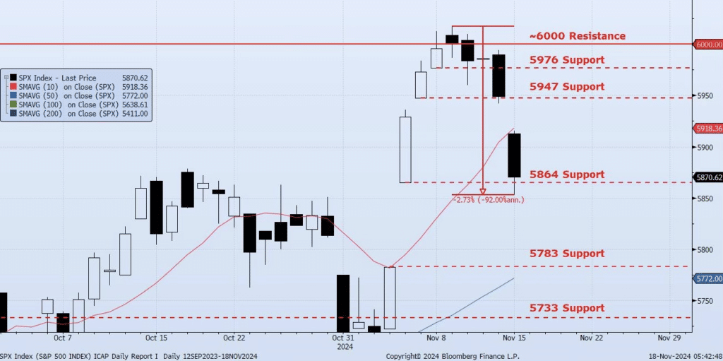 The SPX Index gapped down on Friday and faded for the entire session. The Index opened at 5912, hit a low of 5853 and closed at 5870. Once again, this price action was right in line with expectations. For over a week I have been calling for a fade from the ~6000 level. In fact on Nov 12 I wrote that “it feels like a good spot to lighten up on some longs and take a breath.” In my note this past Friday I wrote that I expected “a lot of supply and fear still to hit the tape.” The Index has now faded peak-to-trough -2.73% from the Nov 11 high (ref 6017) to Friday’s low (ref 5853). Previously identified support levels/targets have been tested or broken at 5976, 5947, 5864 (intraday only). The ICAP Momentum/Trend (MOTR) Model remains in Neutral as all but one input are marked as negative. I expect there to be a shift to Negative over the next few sessions. I expect 5864 to break, setting up for a filling of the first “Trump Gap” down to 5783 (Nov 5 high). As this gap is filled, I would expect Spot VIX and Term Structure to shift higher as well with a current upside target for Spot VIX in the 20 to 23 range. Simply put, in my opinion, this dip is not done.