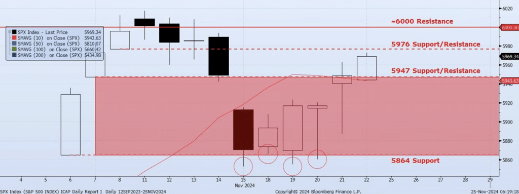 The SPX Index gained 35bps on Friday, closing at 5969. The high of 5972 was within four handles of the highlighted 5976 level (previous support, now resistance). The support/resistance range which I have been focused on is 5864/5947. After four consecutive tests of support at 5864 (Nov 15, 18, 19, 20) the Index has now rallied through 5947 with confirming momentum and volatility. The ICAP Momentum/Trend (MOTR) Model has shifted to Neutral from Negative. The recent price action and model shift were not what I expected. All said, my cautious tone is fading as the Index seems to be gearing up for a year-end rally.