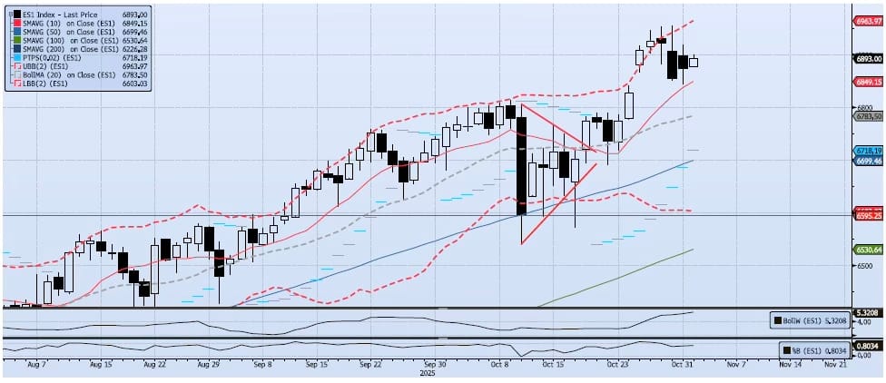 The ES1 Index (Generic 1st Month S&P 500 E-mini) gained 27bps during Friday’s session, closing at 6874. The low on the session (ref 6843) came within 5 handles of the 10dma (ref 6837) and bounced into the bell. My Spot VIX signal remains “risk on”. My VIX Term Structure signal is “risk on”. The ACAP Momentum/Trend Model signal for the ES1 Index is Positive. I continue to see risk skewed to the upside from here as the index seems poised to test 7000/7050 before year end.