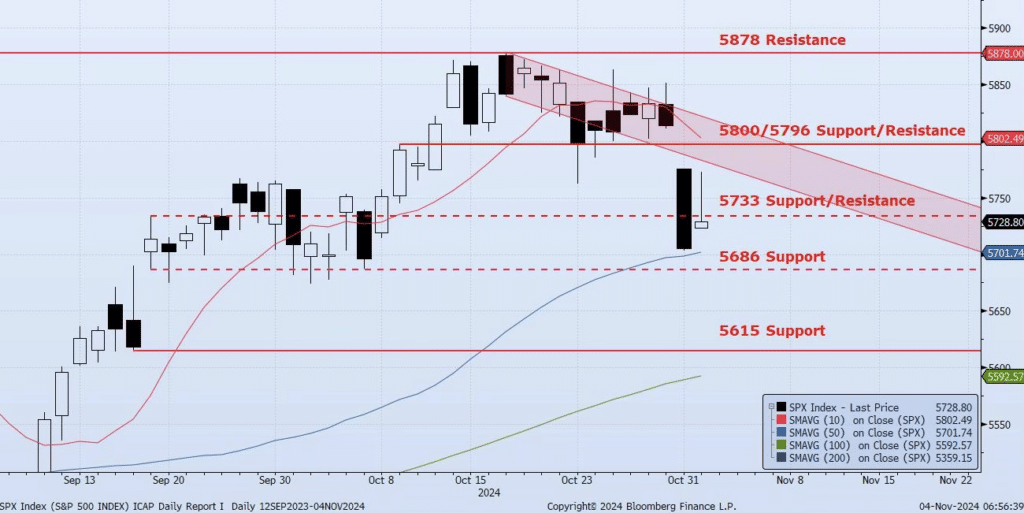 The SPX Index, after a down 1.86% day on Oct 31, attempted to bounce back on Friday. The Index opened up at 5723 and rallied early to a high of 5772. This was 1.22% above the Oct 31 low. The Index then failed, closing back below the 5733 level at 5728. I wrote in the last report that “While the risk of a snapback rally exists, risk overall remains to the downside.” I continue to believe this to be the case as we head into a week of massive price volatility coupled with a deep Negative signal from the ICAP Momentum/Trend (MOTR) Model. All in, I expect prices to swing, volatility to elevate further and the Oct 31 low of 5702 to be tested at a minimum. On a break below this level I would look for a test of the 5686 and 5615 levels below.