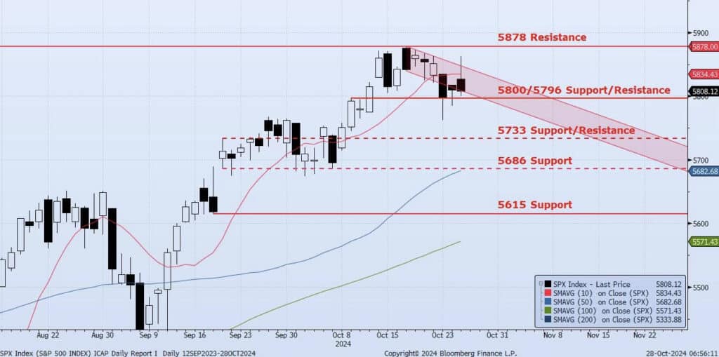 The SPX Index hit an early session high of 5862 on Friday only to reverse and fade down to a late session low of 5799 and a closing print of 5808. The Index was clearly under pressure intraday but closed down just 3bps. I would note that the previously identified 5796/5800 support level did hold on an intraday and closing basis. Spot VIX did bounce off its 50dma (ref 18.23) and closed up 6.55% at 20.33. This action, along with Term Structure, was “risk off” but far from panic. The ICAP Momentum/Trend (MOTR) Model remains Negative. Overall, risk remains skewed to the downside with my expectation for price volatility increasing as we move through the final days until the election. That said, I remain net short in the portfolio with exposures paired down heading into next week.