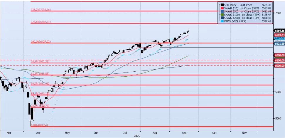 The SPX index gained 49bps during Friday’s session, hitting a new all-time high (ref 6671) and all-time closing high (ref 6664). My momentum and trend indicators continue to expand as price emerges from the Aug 13-Sep 4 consolidation. My Spot VIX signal remains “neutral”. My VIX Term Structure signal remains “risk on”. The ACAP Momentum/Trend Model signal is Positive. As I wrote back on Aug 22, “ACAP signal aside for a moment, I would be a buyer above 6400 and a seller below 6343 (Aug 20 low).” That approach has paid off well as the index is now ~4% above that 6400 level with risk skewed to the upside.