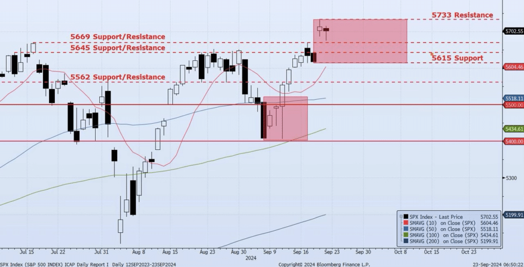 As expected, last week was extremely volatile for the SPX Index with a trading range of over 2% and intraday swings of as much as ~1.5%. Volumes were above average as Spot VIX hit a low for the week at 15.81. My ICAP Momentum/Trend (MOTR) Model shifted from Neutral to Positive on Sep 19 and remains there into today’s cash open. While I base my entire portfolio on MOTR, there is discretion as far as sizing and outright positioning. I do not make a habit of trading against the signal, but I do at times pair down exposure or step aside (go flat) if my gut is not in line. This is one of those times. The current set up is not as appealing as I would like it to be. With that all said, I am net long but I remain paired down substantially. The near-term support/resistance range which I am focused on is 5615/5733 (highlighted on chart). A breakout above 5733 with a Positive (confirming) MOTR Signal would be very bullish. There I would add significantly to my long exposure. Ahead of that I am net long, paired down and watching.