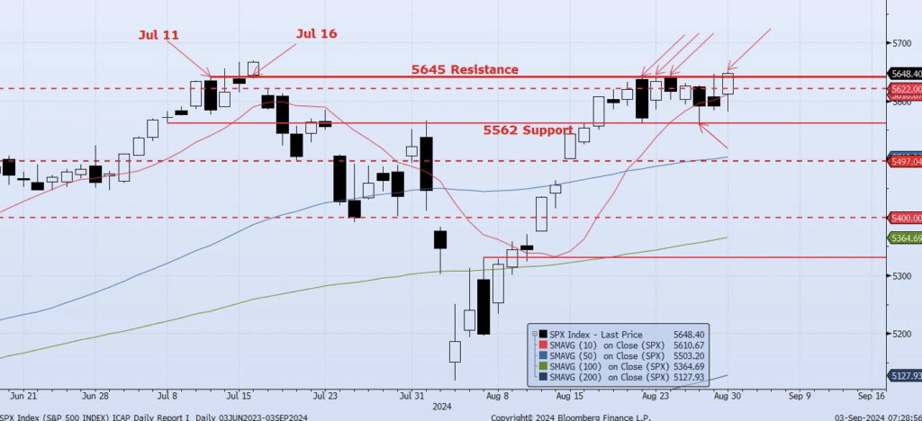 The SPX closed Friday’s session with a 1% gain, most of which came from an end of day (end of month) rally of over 1% from the session low of 5581 to the closing price of 5648. The late day high for the Index was 5651, just slightly above the identified near term resistance level of 5645 which we have been focused on (see chart). The VIX Index settled down slightly to close at 15.55. Overall, price action was neutral with some volatility and a continued inability to break out above resistance but a continued ability to violate 5600 to the downside. My Momentum/Trend (MOTR) Model remains Neutral for the 7th session as the signal continues to slowly degrade back towards Negative. At the same time, Spot VIX is Negative as the signal there slowly improves towards Positive. These coinciding signals are setting up for a potential drawdown in the SPX and will be watched carefully. Overall, the SPX remains jammed between a near term support/resistance range of 5562/5645. I am watching for either level to break with a confirming MOTR signal. The odds of that being a break to the downside are increasing. I would remain cautious here.