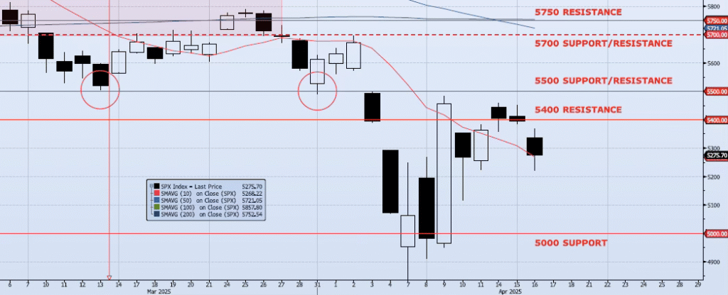 The SPX index fell 2.24% during yesterday’s session, closing at 5275. This close came well below the previously identified resistance level at 5400. In fact, as I wrote yesterday morning, “I would focus on the 5400 level (cash) and the 5364 level (front month futures – ESM5). Breaks below these levels should ignite some additional selling.” This is exactly what happened. The session low of 5220 matches the Apr 11 low and could act as near-term support, but I don’t think it will. My momentum and trend indicators are showing signs of stalling as Spot VIX and VIX term structure remain mixed. The ICAP Momentum/Trend (MOTR) Model signal remains Neutral. I will continue to be a seller of all counter trend rallies until I am proven wrong or my additional downside targets for the entire move of 4800, 4200 and 3700 are achieved. I was asked the other day, so I am opening up here, the net return for the ICAP portfolio 2025 YTD is currently 30.63%. Additionally, we are in the middle of a capital raise effort. The fund structure and name may be changing in the coming weeks. If and when, I will broadcast the changes widely.