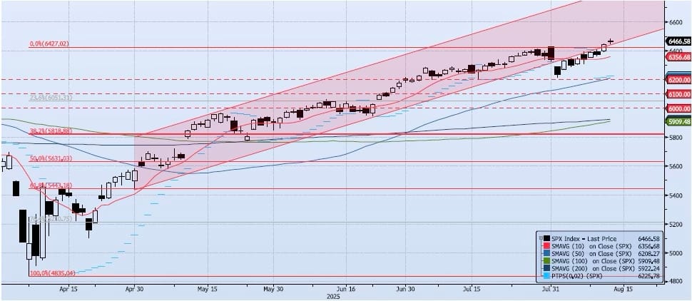 The SPX index gained 32bps yesterday, closing at another all-time high of 6466. The index has clearly broken back into the intermediate term uptrend channel and is well above previous resistance at 6400. My momentum and trend indicators continue to expand. My Spot VIX signal is “risk on”. VIX Term Structure is “risk on” as well. The ACAP Momentum/Trend Model signal has shifted to Positive. Over the past week I have been focused on the index re-entering the uptrend channel and breaking out above 6400 with a confirming ACAP signal. This has all occurred and sets up well for a test of 6600 in the intermediate term.