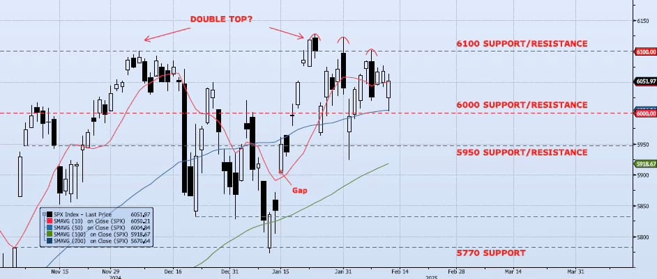The SPX Index closed the session down just 27bps at 6051. The index hit an early session low of 6003 (down ~1%) but held support at both the 50dma (ref 6004) and the previously identified 6000 level. The manic push out of the index heading into the cash open is yet another example of high price volatility and a lack of conviction at all-time highs. Neither of which are bullish. As I have continued to reiterate, “price is showing signs of topping near all-time highs as momentum and trend indicators continue to degrade. Additionally, Spot VIX and VIX Term Structure signals remain mixed/neutral.” The ICAP Momentum/Trend (MOTR) Model signal shifted to Negative. The length of the previous Neutral signal was impressive as multiple inputs had already shifted, leaving the MOTR signal waiting for one final turn. This was confirmed on the close yesterday. I continue to see risk as skewed to the downside and expect the 6000 level to break in the near term setting up for an initial downside target of 5850/5900 (Jan 14/15 gap).