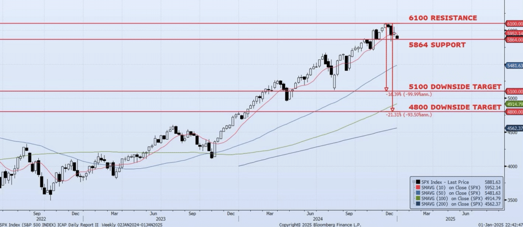 The SPX Index ended 2024 with a down 43 bp session, closing the year out at 5881.63. The Index once again tested the 5864 support level, hitting a low for the day at 5868. The Index had a tremendous 2024 with a return of 24% but December seemed to shift a bit against that grain, marking down 2.5% for the month. Market internals continue to fade. Near term trend is broken. Spot VIX and VIX Term Structure (slope) are flashing warning signs. The ICAP Momentum/Trend (MOTR) Model signal remains Negative. My model and data points suggest the Index is set up for a significant move to the downside during Q1/Q2. The chart below is a Weekly SPX chart rather than the normal Daily count. I think this view is helpful in eliminating some of the noise. I believe the Index is forming a top in the broader range of 5864/6100 with peak-to-trough downside targets of 5100 (down ~16%) and 4800 (down ~21%). These targets are very reasonable, and I believe they will be achieved by the end of Q2. Let’s see how price and internals progress through January.